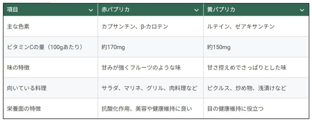 表で改めて確認すると、赤と黄のパプリカの特徴や使い方が明確になり、理解が深まりますね。