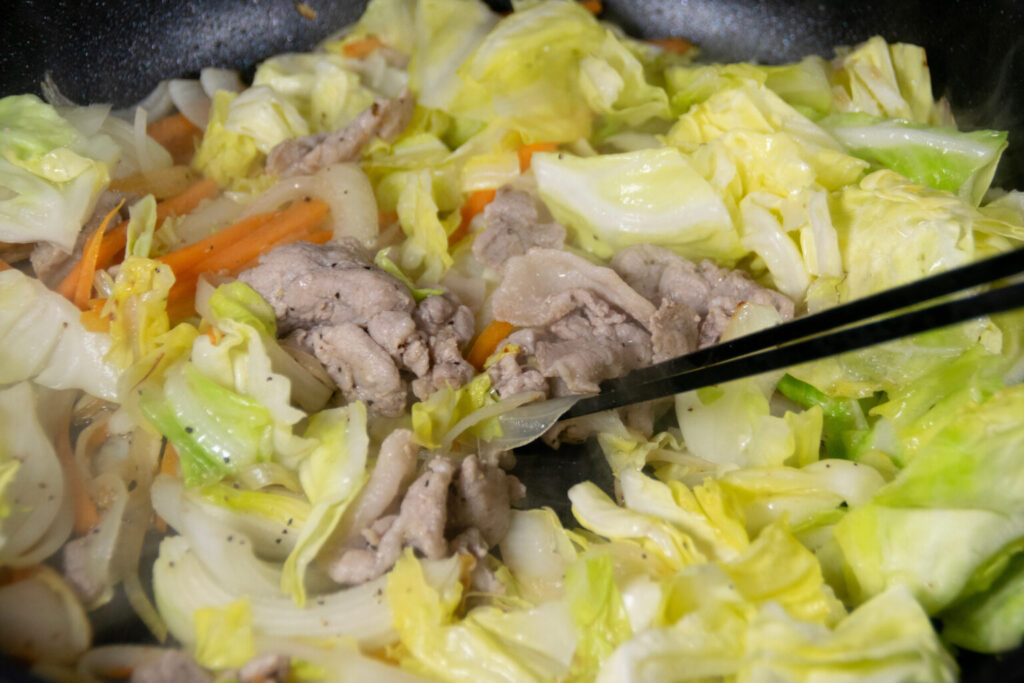 炒める順番は「火が通りにくいものから」が鉄則です。まず人参や玉ねぎなどを入れて炒め、少し火が通ってからキャベツやピーマンを入れるとムラが少なくなります。
