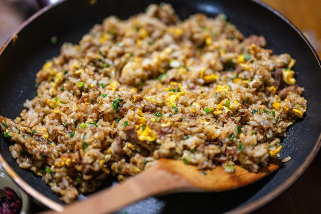 ご飯がパラパラに仕上がったタイミングで最後に戻し入れ、全体を合わせる手法をとれば、具材から出る水分でご飯が湿るリスクを最小限に抑えることができます。