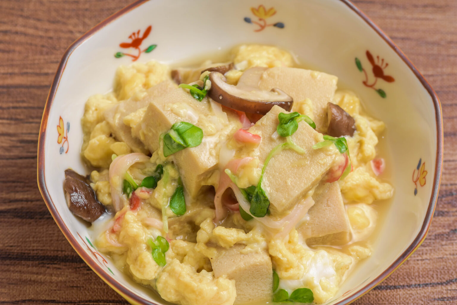 まずは下準備から始めましょう。木綿豆腐を食べやすい大きさに6等分ほどにカットし、玉ねぎは薄切りにします。卵は2個割り入れ、白身が残る程度に軽く溶いておくのがコツだそうですよ。