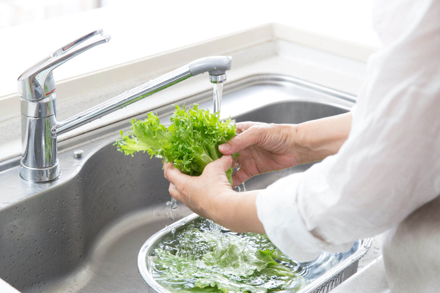虫食い箇所や虫がくっついていた箇所を取り除いたら、流水でよく洗いましょう。特に葉物野菜は、中に他にも虫が潜んでいる可能性があります。しっかり流水で洗うことで、中に隠れている虫たちを洗い流せますよ。