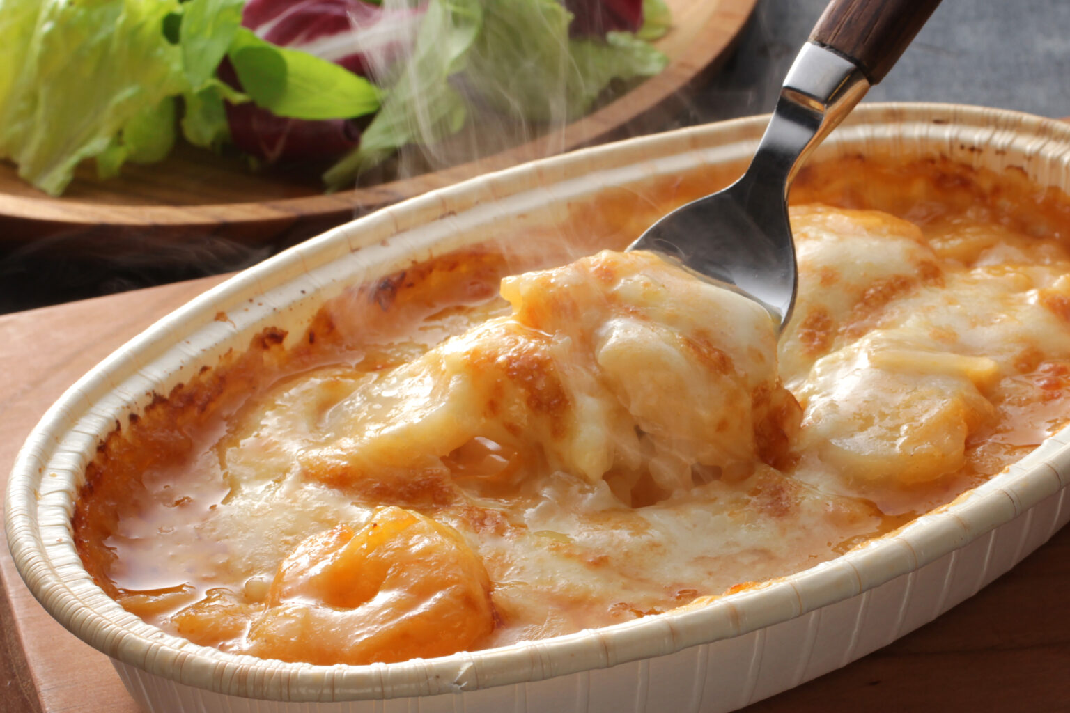 最後に230度に予熱しておいたオーブンに入れて12分ほど焼き上げれば、表面がこんがりと色づいた香ばしい熱々のグラタンの出来上がりです。