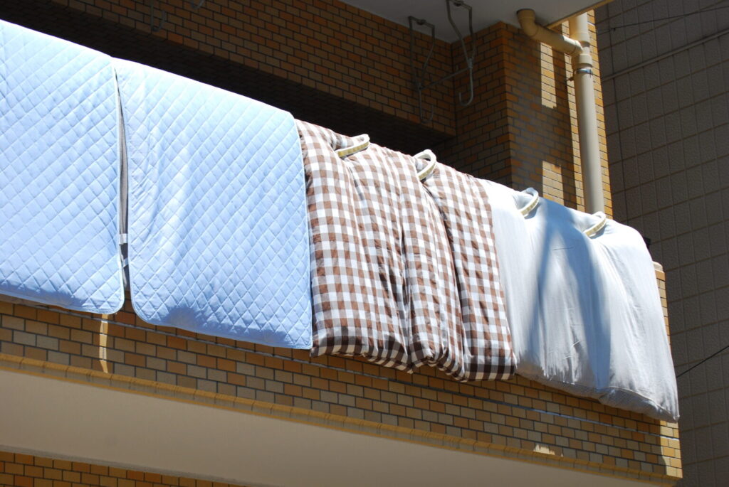 - 掛布団は1~2週間に1回、綿の敷布団は2~3週間に1回を目安に、2時間程度干す