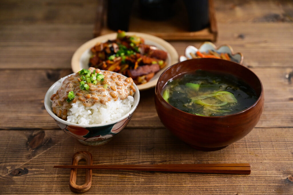 ご飯やパンなどの炭水化物に、納豆や卵、豆腐などのタンパク質を組み合わせましょう。