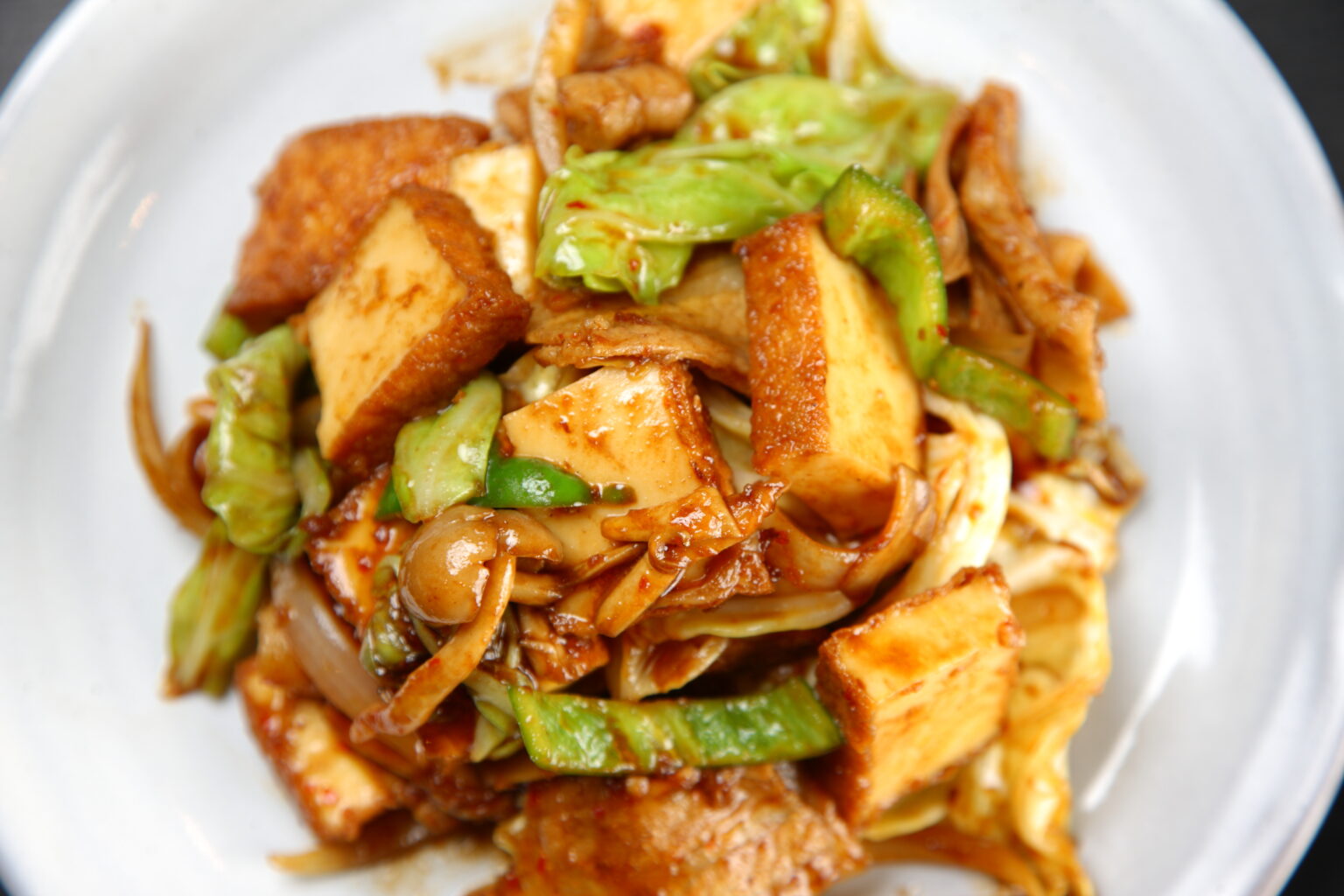 タレが厚揚げに馴染んだ段階でキャベツを加え、全体を大きく混ぜ合わせながら炒めていくと、マヨネーズの油分が溶け出して全体に回ります。