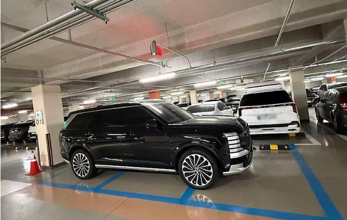 投稿には、1枚の写真が添付されており、そこには現代(ヒョンデ)自動車の黒いパリセードが、3台分の駐車スペースを横向きに使い、占領している光景が写っています。
