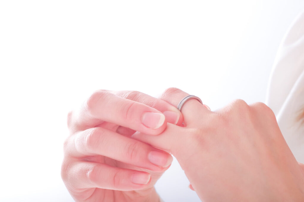 結婚指輪は既婚であることを周囲に知らせる一つの手段になるので、常時身に着けている人は比較的多いです。